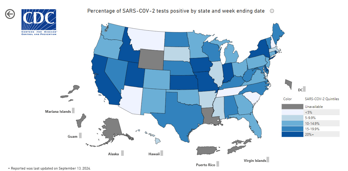 As you can see, RSV levels are very low across the USA. Flu levels are minimal to low, with the exception of Washington, DC which has entered the moderate range. But COVID-19 is circulating pretty widely (states in dark blue have the highest rates).