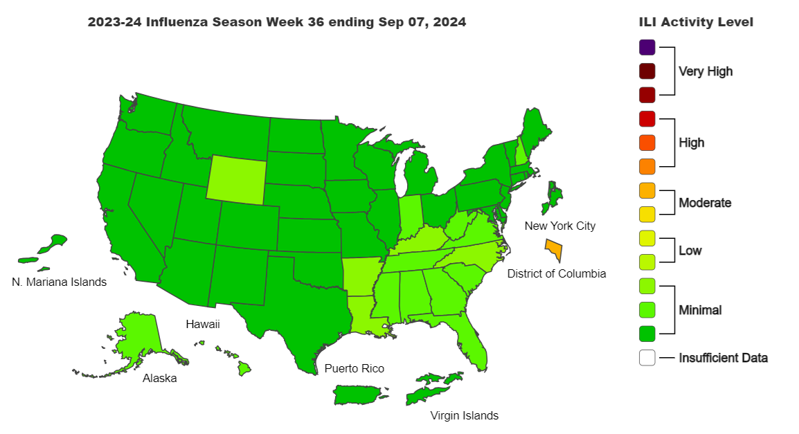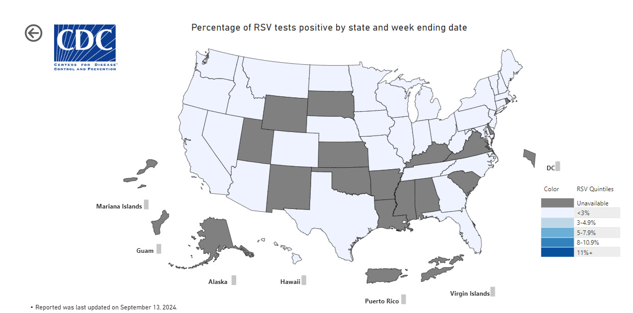 The three vaccine-preventable respiratory diseases that we are worrying about for fall/winter are COVID-19, Flu and Respiratory Syncytial Virus (RSV). Here are the current surveillance maps for these three diseases for the week ending on Sept. 7th.