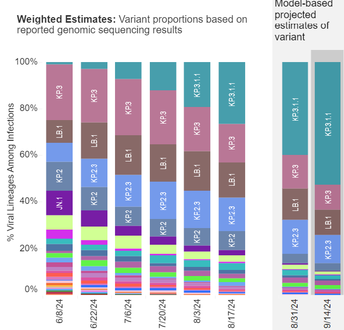 As you can see from the graph below, JN.1 (purple) is still circulating but at a much lower level than KP.2 (blue). KP.3 (pink and teal) is now the dominant strain and it is an offshoot of KP.2 with enhanced transmissibility. It is not yet known how well the 2024-2025 vaccines will protect against KP.3, but my gut feeling is that Pfizer/Moderna will provide good protection since KP.2 and KP.3 are so closely related.