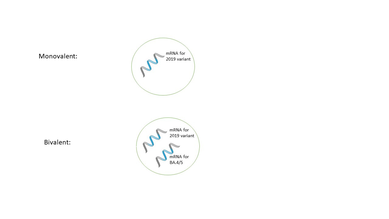 The updated vaccines are BIVALENT (meaning they protect against two different viruses). Both Pfizer and Moderna are very similar and their updated vaccines contain the original mRNA from the monovalent vaccine plus a new mRNA from an Omicron variant, BA.4/5.